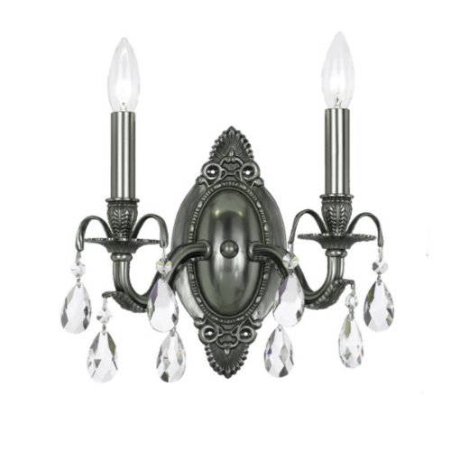 5562-PW-CL-SAQ Crystal Type: Swarovski Spectra Features: -Wall sconce.-Available in majestic wood hand polished, swarovski spectra, swarovski strass, golden teak hand polished or golden teak swarovski strass crystals.-Majestic wood polished crystal.-UL listed. Construction: -Brass construction. Color/Finish: -Pewter finish. Specifications: -Accommodates (2) 60W candelabra bulbs. Dimensions: -Overall dimensions: 12'' H x 10.5'' W x 5.5'' D.