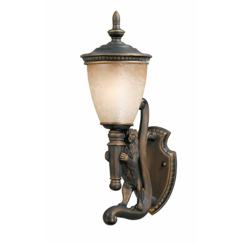 Triarch International 75231-14-L Left Lion Exterior Light in an Oil Rubbed Bronze finish and Gold Highlights with Antiqued Hand Blown Glass Oil Rubbed Bronze Cognac antiqued glass. 2-60 Watt Candle Base bulbs not included UL Approved