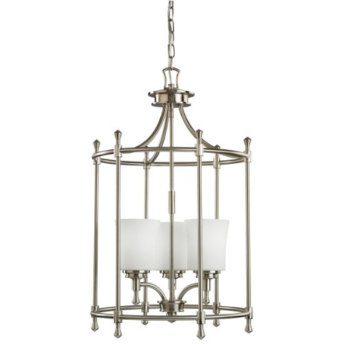 Glass:Satin-Etched Cased Opal, Finish:Brushed Nickel, Light Bulb:(3)100w A19 Med F Incand Not quite contemporary, not fully traditional - this collection envelops Edith Wharton's principles of design. Symmetrical and intriguing the graceful curves of simple lines in this caged foyer piece complement the finish and glass.