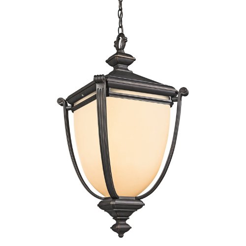 The Warner Park Collection of outdoor lighting offers refined traditional design. The cast aluminum frame is highlighted by graceful, curved arms with scroll tops. Thanks to the included CFL bulb, this fixture offers energy efficient operation. This outdoor hanging light features a rubbed bronze finish and light golden seedy glass. A stylish choice from Kichler.