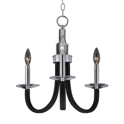 Finish:Chrome/Leather, Light Bulb:(3)60w B10 Cand C Incand Oxford 3-light chandelier is a study in the art of the Avant-Garde where sleek leather, bold chrome, and smooth crystal comes together to offer unbeatable style.