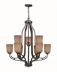 LS-19749 Features: -Nine light chandelier.-Amber glass shade. Color/Finish: -Aged copper finish. Specifications: -Accommodates (9) 60W type A bulb. Dimensions: -Shade dimensions: 4.75'' TW x 1.75'' BW x 6'' H.-Overall dimensions: 33'' H x 30'' W.