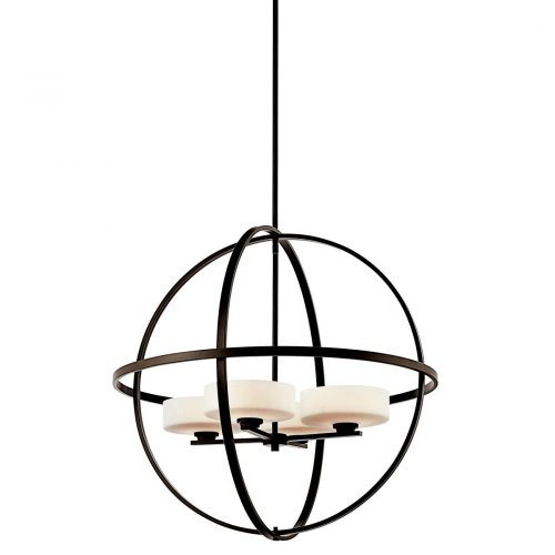 Finish:Olde Bronze, Glass:Satin-Etched Cased Opal, Light Bulb:(4)50w T4 G9 120v Halogen Dynamic in design, yet oh-so simple. That's the beauty behind the Olsay 4-light chandelier. Intersecting perfect circles form an open orb that surrounds the glass shades.