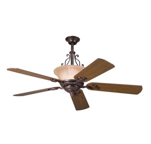 Kichler brings a rich and historic look to a home. With a beautiful Carre Bronze finish and Mocha Wisp glass, this fan's reversible teak/maple blades perfectly round out the design. Getting the best room effect is convenient thanks to the full function CoolTouch control system with independent up and down light control. A decorative yet relaxed look from the talented designers at Kichler. (IMAP)