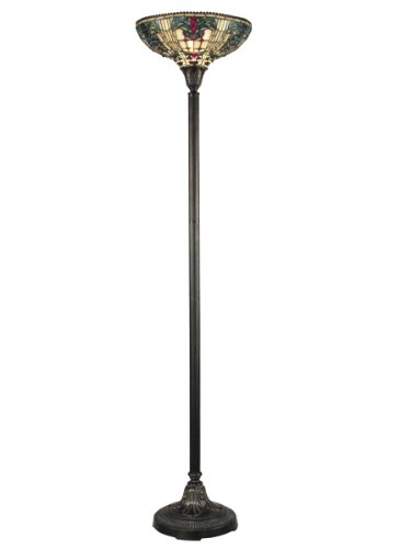 Illuminate your living spaces in classic style with the Jewel Baroque Tiffany style torchiere floor lamp. With the beauty of Tiffany style hand rolled art glass, this piece glows in tones of green, red and ivory. The metal base has a fieldstone finish for an antique look. From Dale Tiffany.