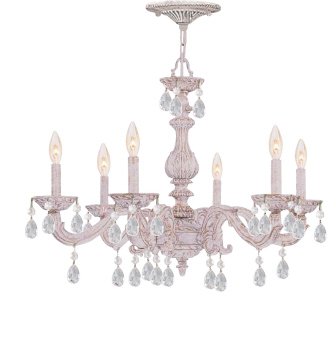 Finish:Antique White, Crystal:All Clear Majestic Wood Polished, Light Bulb:(6)60w B10 Cand C Incand Paris Flea Market Chandelier Casual yet elegant chandelier Intricately detailed and bold in design, this handsome chandelier makes a distinctive and elegant visual statement