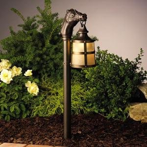 From Kichler Lighting comes this decorative path light which features a horse head post. The whimsical fixture also has a warm look with its olde bronze finish. The horse is holding an accent lantern that has soft light linen glass. Use this fixture to accent your garden decor. Works with existing low voltage landscape lighting systems.