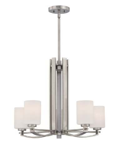 The opal etched glass shades of this 5-light contemporary chandelier complement its architecturally-inspired antique nickel frame. Lights postioned around the center support bring to mind a bustling downtown boulevard. A perfect fit for a dining room, entry way or kitchen. From the Quoizel Taylor Collection.