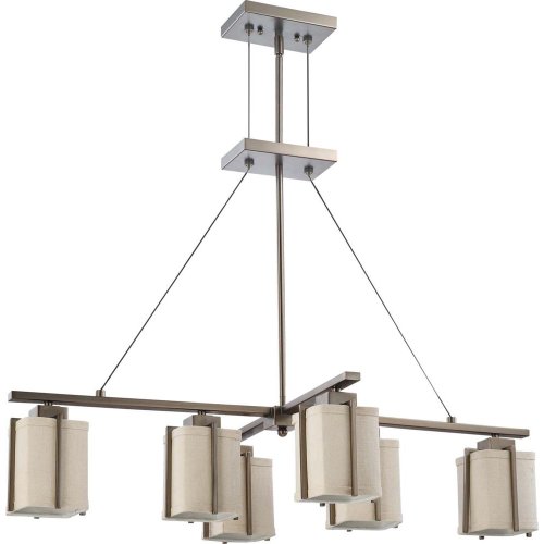 Finish:Hazel Bronze, Shade:Khaki Fabric, Light Bulb:(6)13w Mini Spiral GU24 CFL 6 Light Island Pendant Geometry illuminated fixture Crisp cubes and linear bar wrap this energy efficient fixture for a more vibrant apperance Additional stem lenghts 6' and 12' available, sold separately