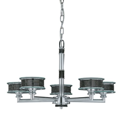 Triarch International 29483 Vegas 5 light chandelier in a chrome finish with glittering rhinestones against a black backdrop sandwiched between frosted glass. chrome frosted glass 5- 40 watt xenon G9 bulbs included UL Approved